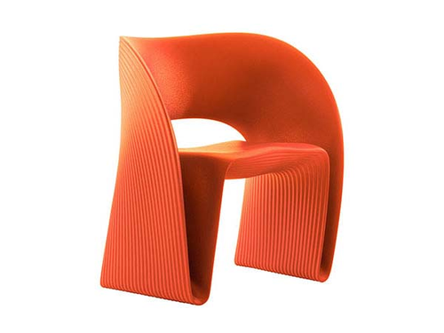 Polyethylene armchair made by rotational molding. The armchair is made up of a single “ribbon” of polyethylene with a smooth texture on the inside and worked on the outside. This particular process enhances the perception of continuity of the “ribbon”, modernist with a particular eye to pop.